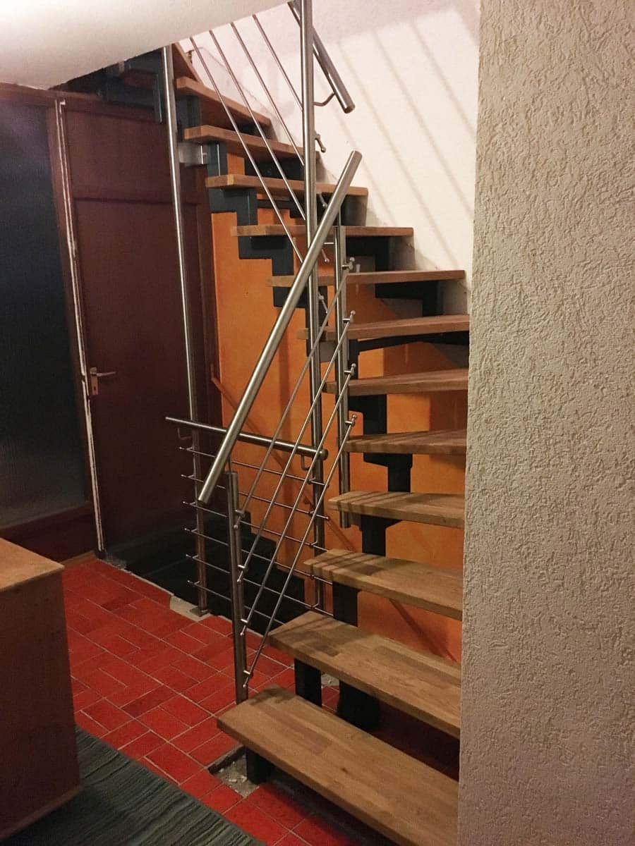Dieses Projekt umfasste die Erstellung einer 3/4-gewendelten Zweiholmtreppe mit Eichentrittstufen und einem Edelstahlgeländer mit einer Rundstabfüllung.